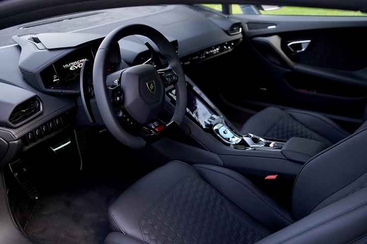 新车的内饰采用全黑色设计,提供标配的舒适座椅及可选配的全新运动座椅,选配座椅更可选择EVO运动风格内饰的单色Alcantara或单色真皮材质。发动机启动按钮盖和头枕上的兰博基尼盾形刺绣标识可选择与外观颜色相同的5种全新荧光色。车辆整体呈现出极具科技感的色彩碰撞效果,为敢于在这个年轻时尚的街头艺术品中展现自我的人们解锁更多表达方式。
