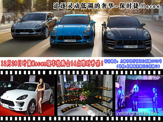 2014年12月28日14:00,“2014年叶隆汽车保时捷Macan岁末限量专场抢购会”隆重开启,本次活动叶隆汽车共有54台macan参加抢购活动,现场订车优惠力度前所未有,超越团购价,还有2万精品豪礼相送,惊喜抽奖等你来参与,活动仅限三个小时,2014年保时捷最后一波直销!要买车过年的朋友们赶紧来报名参加吧!