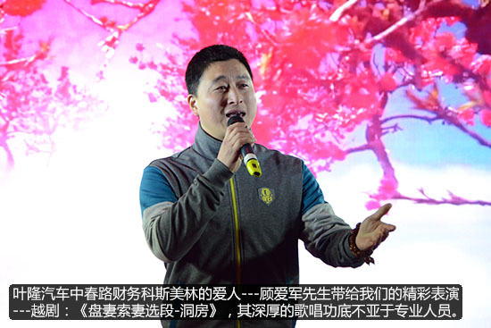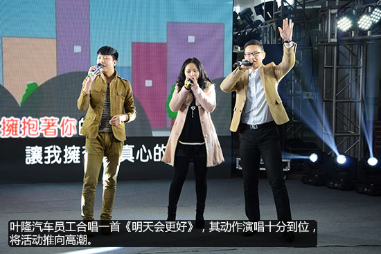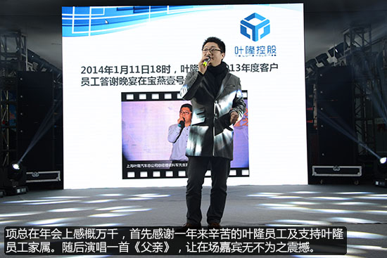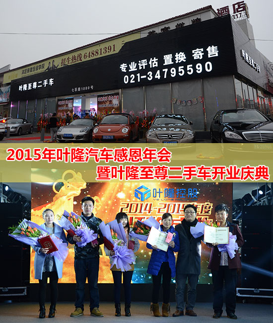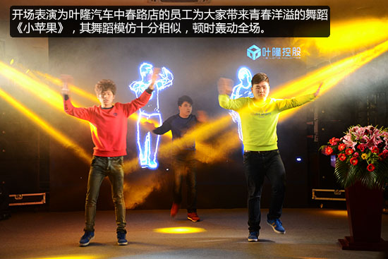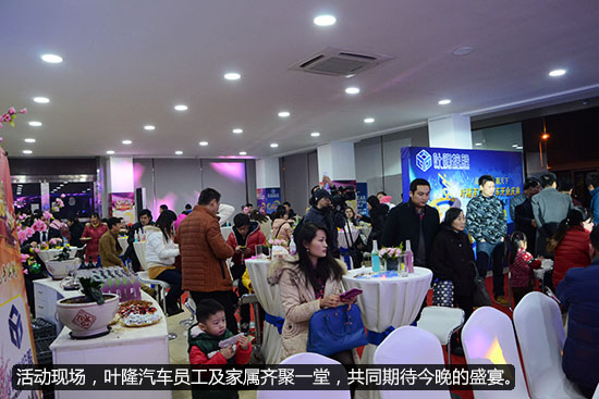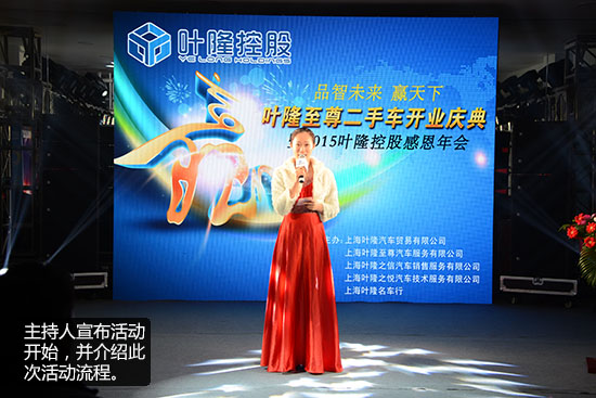 “流年似水,华光如梦。我们收获了成长的痛楚,我们依然步履坚定!我们收获了成功的甜蜜,我们依然奋勇向前!风雨兼程,汗水与泪水铺就了腾飞的道路!携手并进,信心与勇气铸就了不朽的旗帜!叶隆汽车的每一步成长,都凝聚着叶隆汽车所有人的心血”。随着主持人的幕后音,在2015年1月30日,在这辞旧迎新的日子里,叶隆汽车为感谢一直以来辛勤工作的员工以及支持叶隆员工的家属,在位于上海市闵行区七莘路1080号叶隆至尊二手车展厅内举办了一场以“品智天下
