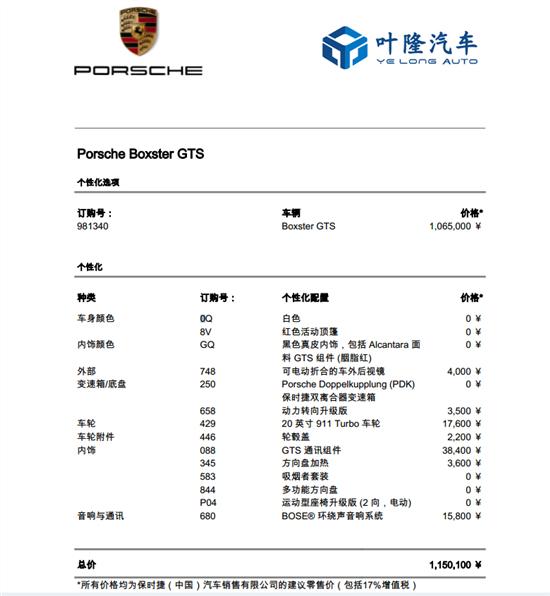 我们拍摄的这台Boxster GTS在经过了需安装后算上增值税总价为115.01万,简单分析一下其实这个价格并不算贵:识别度更高、更酷的外观;4.7秒的0-100km/h加速时间;保时捷自身的品牌价值等等,甚至可以说这是一台性价比相当高的豪华跑车。除此之外,保时捷官方还给出了11.4L的百公里市区油耗数据,对于一台性能跑车来说,这个数字绝对属于低的了,由此也可见得BoxsterGTS不仅性能出众,并且还兼顾了日常驾驶需求!