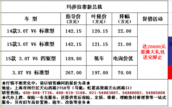 叶隆平行进口车门店近日推出特惠车型--玛莎拉蒂-总裁,最高可优惠51万,现场购车更有20000元大礼包相送。感兴趣的朋友可以打电话详细咨询400-888-7738,具体详情请见下表: