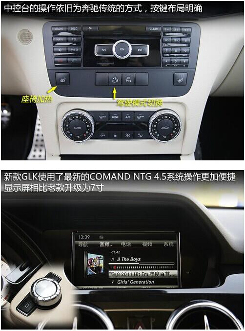 新款GLK配备最新型COMAND NTG 4.5驾驶室管理及数据系统,兼容LINGUATRONIC中文多媒体语音控制系统,带有高清色彩显示屏的17.8厘米快速硬盘导航、COMAND APS可播放MP3/WMA/AAC多种格式的数字音乐;免提电话可通过蓝牙接口播放音乐和显示文本信息;车载媒体接口则用于连接MP3 播放器/iPod 或USB 存储器等各种设备。