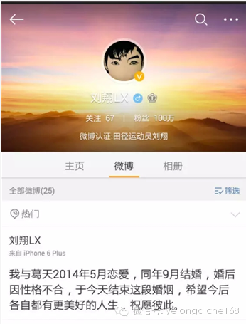 奥运冠军刘翔在微博上宣布离婚,他在微博里写到:“我与葛天2014年5月恋爱,同年9月结婚,婚后因性格不合,于今天结束这段婚姻,希望今后各自都有更美好的人生,祝愿彼此。”