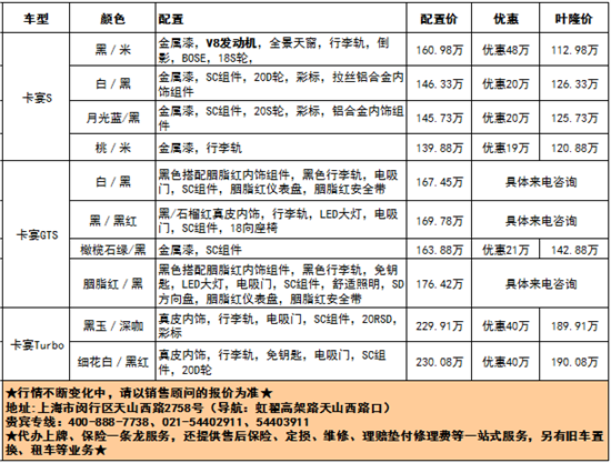 冲量钜惠,叶隆保时捷中心卡宴现车送礼包、维修基金,咨询热线:400-888-7738,优惠车型见下表: