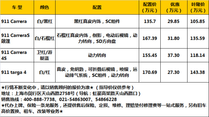 近日,编辑从上海叶隆之信保时捷中心了解到,保时捷911最高降37.3万,另送豪华精美装潢,到店详谈还有更多优惠,有意向的朋友可打电话详细咨询。