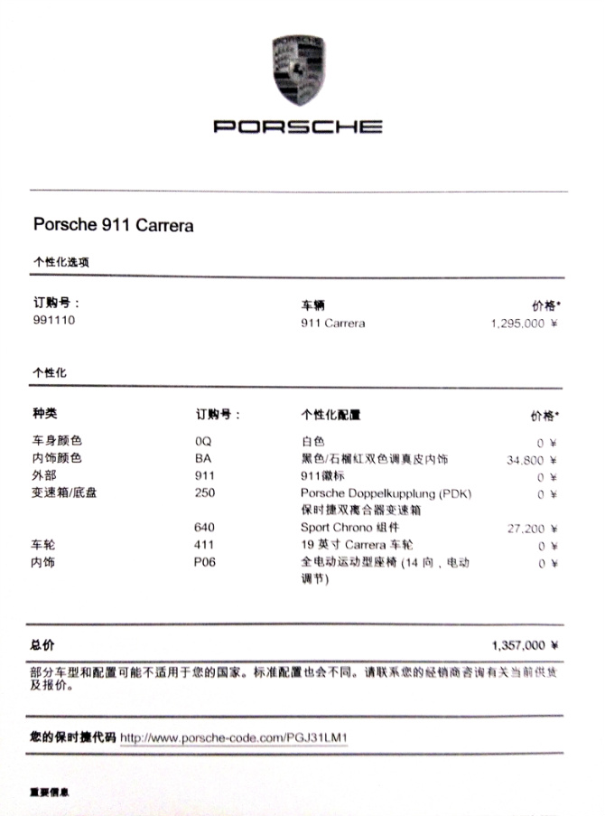 保时捷 911 车系的巅峰之作,新一代 911 不仅在性能与效率方面树立了全新标杆,更以杰出的日常实用性成为了同级车型的价值典范。911 Carrera 前轮距增加了46 mm,结合更低的车顶美观,凸显了整车的动感特色。经典的造型使保时捷的基因得以传承下去,也塑造了跑车迷心中独一无二的保时捷招牌形象。车型日新月异的今天,不断变更的细节以及运动感元素的添加让一代代的车型都能走在时尚的尖端。