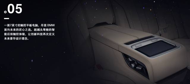 一面7英寸的触摸平板电脑,尽显BMW面向未来的匠心之选。超越头等舱的智能后排触控体验,让创新科技再次定义未来豪华设计理念。