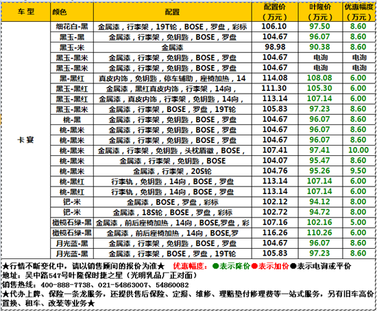 在西班牙语中,cayenne是“辣椒”的意思,而这款著名跑车生产厂家生产的越野车无论是外在还是内在,也确实像一支火辣辣的辣椒,吸引着人们的目光。叶隆保时捷之星多款卡宴钜惠,带你体会卡宴的速度与激情。