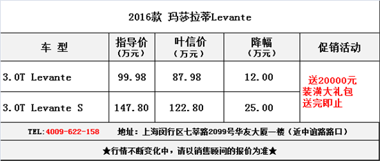 近日,笔者从上海地区经销商叶信名车了解到,目前玛莎拉蒂莱凡特优惠高达25万元,购车另送价值2万元装潢大礼包。为广大新老客户提供:汽车装潢、旧车置换、购车按揭贷款、代办验车、上牌、保险等最资深,最专业的服务。