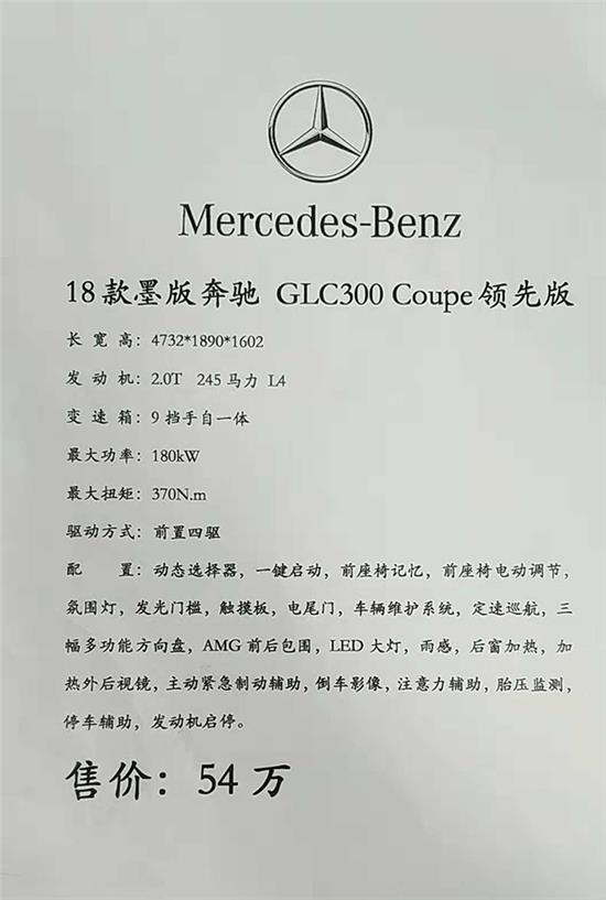 近日,上海叶信汽车店内18款墨版奔驰GLC300COUPE现车到店,高配置低报价,促销价仅54万,近期购车还可赠送价值20000元装潢大礼包一份。相对传统渠道,平行进口车墨版奔驰GLC300COUPE性价比突出,很值得考虑。对这款车感兴趣的车友欢迎您莅临本店品鉴或来电咨询最新优惠价格