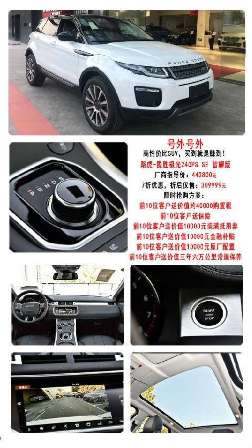 近日上海叶信汽车店内有一批全新路虎揽胜极光特价出促销。高性价比SUV,买到就是赚到!路虎揽胜极光240PS SE智耀版厂家指导价:442800元,7折优惠,折后仅售30万元。