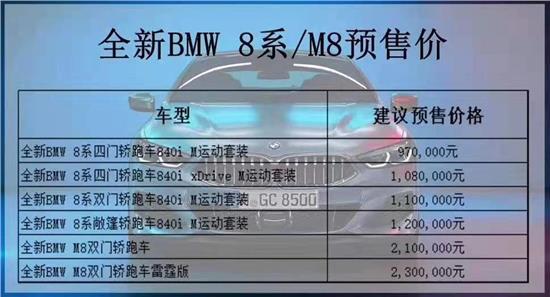 日前,全新BMW 8系及M8轿跑车正式开启预售,新车预售97万元起,新车定位大型GT跑车,同步推出硬顶版和敞篷版,搭载4.4T V8动力。上海叶信汽车现已接受预订,首批名额有限,订车即可享受超值好礼级抢先体验8系的驾驶乐趣。