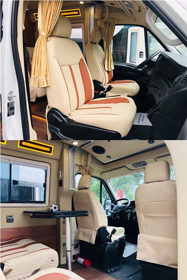 这款依维柯旅居车,按照金冠房车一惯轻量化设计理念,内饰家具全部采用轻质环保材质,浅米色内壁加上木纹色肌理饰板,清新雅致又不失温馨舒适。内部整体布局采用前部沙发会客、中置厨卫以及尾部上下床布局,安全环保,实用可靠。叶隆房车中心现车