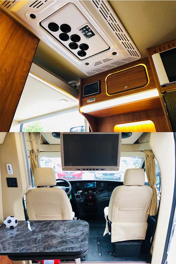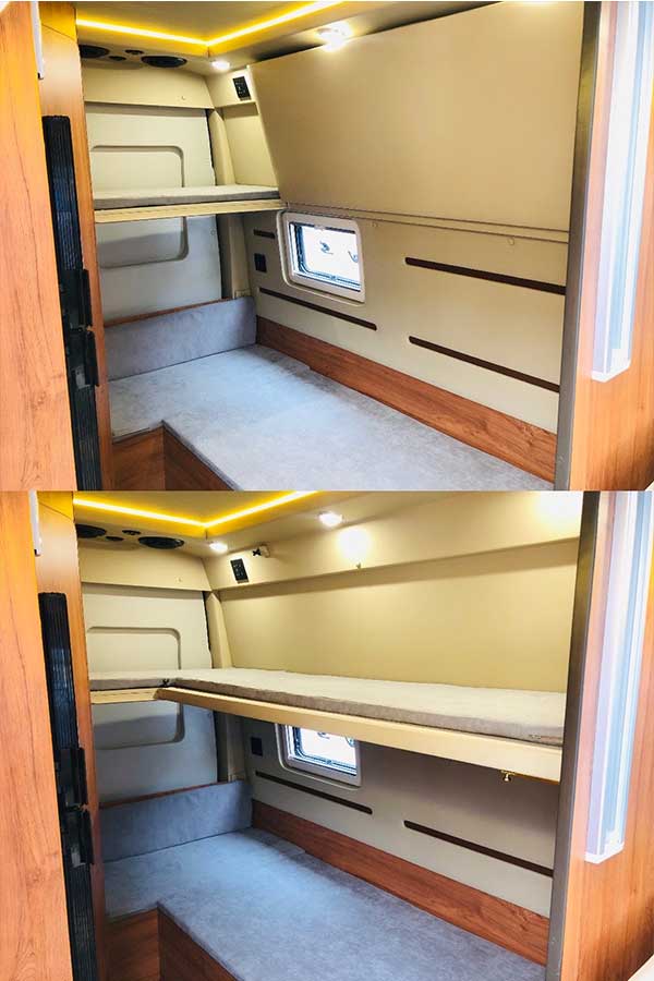 这款依维柯旅居车客舱上方设置一张横置升降床,全自动升降床位富有特色又方便,尺寸为2000*1250mm。床位旁还设置了伸缩钢丝挂绳,方便悬挂软隔或挂晾小物件。叶隆房车中心现车