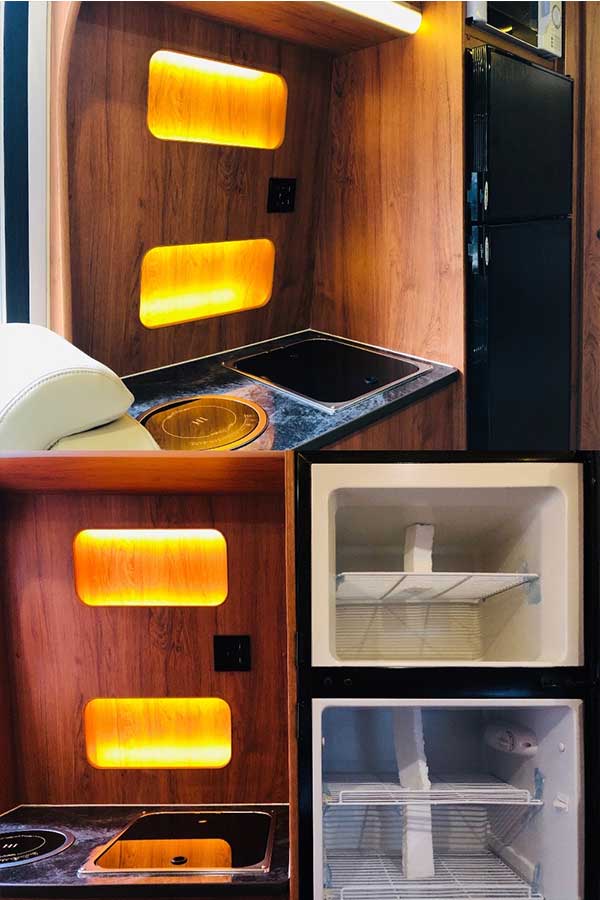 这款依维柯旅居车烹饪区功能十分齐全,厨房区的对过就是一个四人座的布艺卡座,一家人的休息玩耍,聊天打趣,一起聚餐吃饭的场所。操作台也很宽敞,左侧为电磁炉,右侧为盖板洗菜池,满足日常热餐烹饪。叶隆房车中心现车