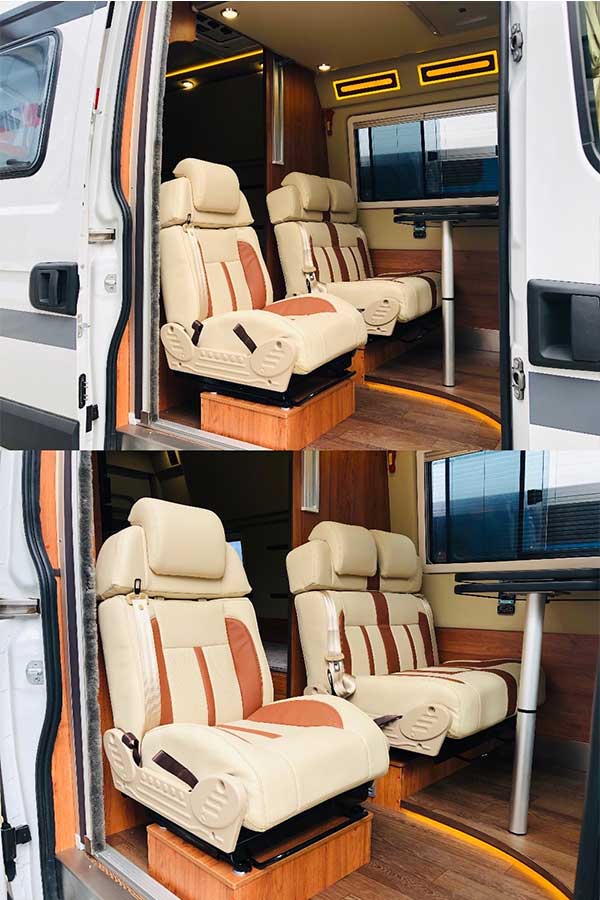 这款依维柯旅居车低调奢华的内饰装修风格,搭配游艇级柚木地板,车壁珍稀凤眼雀木装饰,彰显平稳大气。依维柯超大的空间设计,让商务洽谈氛围舒适轻松,让家庭出游更加舒适放松,满足各种类型的使用需求。叶隆房车中心现车