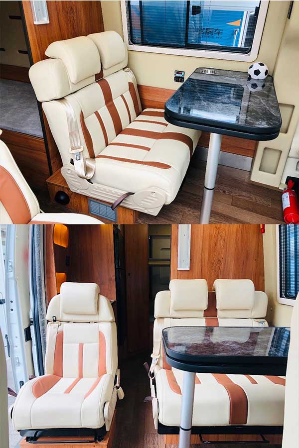 这款依维柯旅居车金冠房车最出色的就要数它的内部设计了,内饰家具全部采用轻质环保材质,浅米色内壁加上木纹色肌理饰板,清新雅致且温馨舒适。客舱前部会客区整组沙发成L型,沙发组下方设置超大储物仓,副驾驶座椅可360度旋转,加上侧位独立单座沙发,配备可升降圆角餐桌,共同组成多人豪华会客区。叶隆房车中心现车