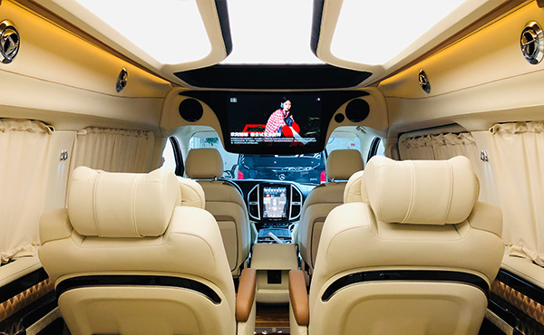 威霆改装房车在前排座椅的后上方,威霆还设置了19寸的吊顶电视,顾全了一定的娱乐享受,需要观看的时候一个按键打开电源即可观看视频节目,出门在外也如居家般自在。