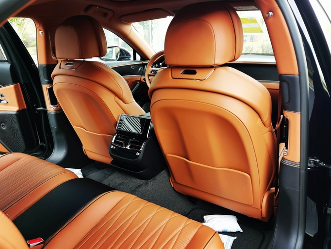 宾利飞驰全车座椅均采用顶级真皮包裹,舒适性极高。前排座椅腿部支撑可以延长,对大腿的承托更到位,长途乘坐也不会感觉疲惫。内饰采用品质一流的真皮和饰面,面料上的每一道缝线均为手工缝制。每一层饰面全部由手工上漆、打磨。从实木和真皮材料到支持车辆信息娱乐技术的硬件架构,整个车舱完全采用手工装配。